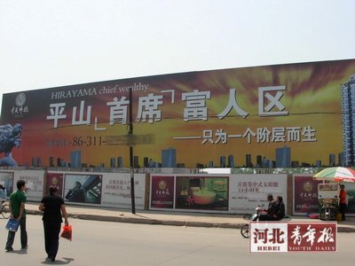 “平山‘首席’富人區(qū)——只為一個(gè)階層而生!睆娜ツ觊_(kāi)始,位于平山縣繁華地段的這則巨幅樓盤(pán)廣告就吸引了不少路人的目光,也引來(lái)了不少爭(zhēng)議。