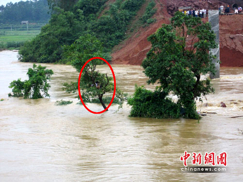 中新網南寧6月3日電 (王剛 韋龍貴)暴雨襲擊廣西,廣西玉林一名男子帶著小狗不斷往高處逃跑,最后爬樹避水求生,不斷上漲的水位把他逼到了樹頂端。所幸玉林消防官兵聞訊趕至,此時男子和狗已被圍困了9個多小時。