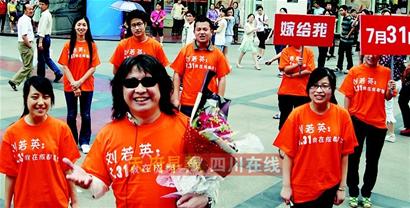 下午3時(shí),春熙路口出現(xiàn)一群身著橘色T恤衫的年輕人,T恤上印有“支持奶茶哥,7·31我在成都等你”等字樣。他們迅速排成一個(gè)“心”形隊(duì)列,手舉紅色的口號(hào)牌大喊:“劉若英,嫁給‘奶茶哥’吧!”“眼尖”的市民立馬就認(rèn)出了站在隊(duì)伍最前面的“莫扎特趙”,就是現(xiàn)在廣為成都市民所熟知的“奶茶哥”!澳滩韪纭贝髦R,身穿橘色T恤、白色休閑褲,手上捧著一大束玫瑰花,看起來(lái)心情不錯(cuò)。