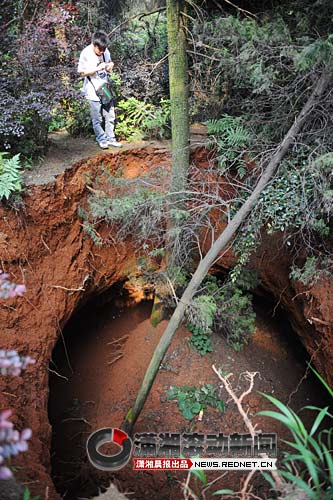 金福喜推測(cè)“天坑”產(chǎn)生的過(guò)程:數(shù)萬(wàn)年甚至數(shù)百萬(wàn)年前,此處地下就存在一個(gè)溶洞。長(zhǎng)沙進(jìn)入雨季,地下水位上漲,溶洞內(nèi)空氣被壓縮,向上沖撞土層;停雨時(shí)地下水位下降,洞內(nèi)氣壓降低,土層被向內(nèi)“吸”。“這里是山坡,水位變化快,溶洞內(nèi)就像有一只打氣筒,對(duì)表層土壤的破壞很大。加上外界雨水沖刷,力度達(dá)到一定程度時(shí),土層就垮塌了。”