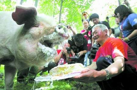 昨日,建川博物館為“豬堅(jiān)強(qiáng)”辦了新生兩周年慶典!柏i堅(jiān)強(qiáng)”洗了澡,穿上了新衣服,引來(lái)眾多游客圍觀。第一次吃生日蛋糕,“豬堅(jiān)強(qiáng)”胃口很好,3分鐘就吃完了。
