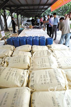 4月22日,東莞、廣州兩地警方聯(lián)合偵破了這起代號為“330A”特大武裝制毒販毒案,抓獲潘×斌等15人,搗毀制毒工場一個(gè),繳獲K粉、冰毒等毒品287公斤、制毒原料羥亞胺1噸多,查獲美制式手槍和仿“64式”手槍各1支,扣押毒資250萬余元,作案車輛4輛。