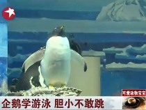 可愛小企鵝學游泳 膽小不敢跳下水