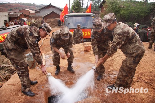 圖:消防官兵為貴州黔西南旱區(qū)百姓送水