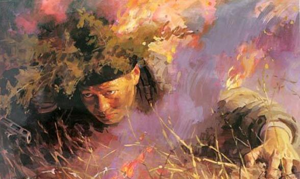 他們埋伏的地方,在三九一高地的山坡上,離山頂上的敵人只有60公尺.要在這里隱蔽20多個鐘頭,實在是不容易的.昨天,從這里飛出一只野雞,敵人還連槍夾炮地打了半天.邱少云等趁著天黑,摸到了這里,他們分成小組,散布開來.每個人從頭到腳都插上了茅草,涼風(fēng)一吹,人身上的草和山坡上的草一同擺動著,露不出一點馬腳.山上的敵人,可被他們看得清清楚楚,連敵人講話都能聽到.