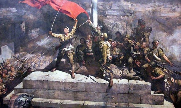 《占領(lǐng)總統(tǒng)府》表現(xiàn)的是中國(guó)人民解放軍占領(lǐng)南京總統(tǒng)府,升上紅旗的場(chǎng)面,標(biāo)志著蔣家王朝的滅亡,新中國(guó)的開始。作品場(chǎng)面壯觀,氣勢(shì)恢弘。畫家用現(xiàn)實(shí)主義的創(chuàng)作方法使這一歷史題材的創(chuàng)作具有紀(jì)念碑的意義。