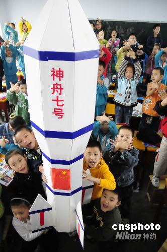 圖:常萬全家鄉(xiāng)小學(xué)生!吧裰燮咛枴卑l(fā)射成功