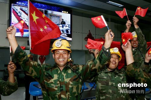 安徽淮北煤礦礦工歡慶“神七”發(fā)射成功