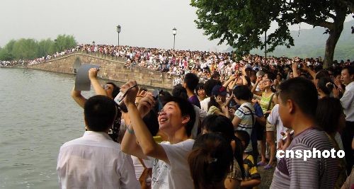 中國各地群眾觀看日食奇觀:西湖觀"食"人如潮