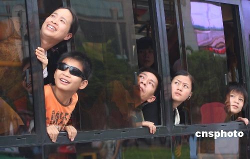 中國各地群眾觀看日食奇觀:南寧市民公交車上觀日偏食