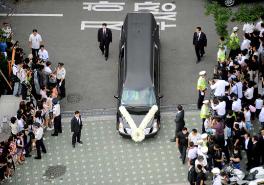 圖:韓國前總統(tǒng)金大中靈柩運(yùn)往國會靈堂