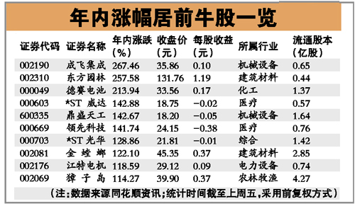 流通盤股本不大,是年內牛股的又一大特點。前20名牛股中,中小板股票有8家,占四成。而流通股本超過2億股的只有7家;流通股本在2億股以下的有13家(含2億股),占全部20家公司的65%,其中,漲幅居前的幾只牛股中,有三只流通盤在7000萬股以下。大牛股東方園林(002310)是一只流通盤才2175萬股的袖珍小盤股(送股前),成飛集成總股本不過是2.06億股,流通股本6504萬股,是典型的“大行業(yè)、小公司”。(李成 )