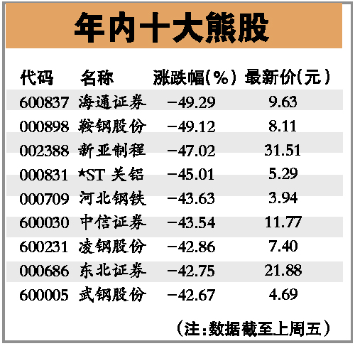 盡管截至上周五,大盤年內跌666.40點,跌幅高達20.33%,不過,許多股票卻創(chuàng)出歷史新高。本報統計發(fā)現,截至上周五,兩市A股中,有100多只股票年內漲幅超過50%,20只股票年內漲幅超過100%,三只股票年內漲幅更是高達200%以上(含200%)。