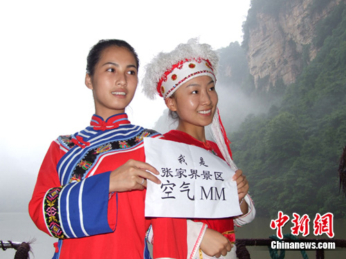 張家界國(guó)家森林公園空氣中負(fù)氧離子的含量達(dá)每立方厘米10萬(wàn)個(gè),是個(gè)名副其實(shí)的天然氧吧。為了吸引更多游客來(lái)張家界呼吸清新的空氣,兩位自稱(chēng)“空氣妹妹”的少數(shù)民族女孩近日在張家界寶峰湖景區(qū)自發(fā)向中外游客推薦這一新特產(chǎn)——張家界空氣。周蘆屾 攝