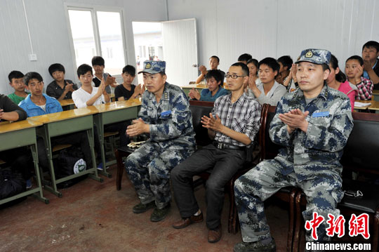 5月14日,在四川蘆山地震震中龍門鄉(xiāng)的晨陽(yáng)希望學(xué)校九年級(jí)二班的板房教室里,舉辦了一次特殊的班會(huì)。安源 攝