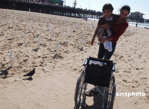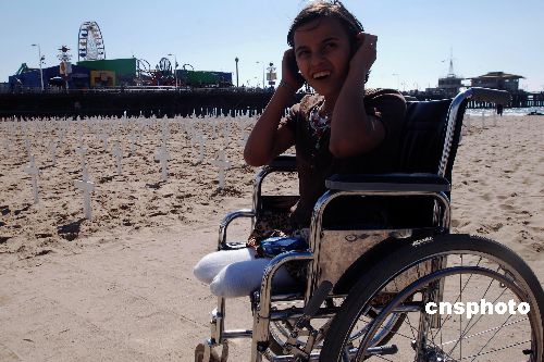 被戰(zhàn)火奪去雙腿的十歲伊拉克女孩薩利·阿拉維,十月中旬來(lái)到美國(guó)洛杉磯最美麗海灘之一的圣塔莫尼卡,訪美五天里為同樣在戰(zhàn)爭(zhēng)中受重傷的姐姐籌集治療款。她去年十一月七日與哥哥姐姐和朋友們?cè)诩议T(mén)口玩耍時(shí)遭到導(dǎo)彈襲擊,哥哥當(dāng)場(chǎng)被爆炸奪去生命,姐姐腿部受到重傷。中新社發(fā) 賈國(guó)榮 攝