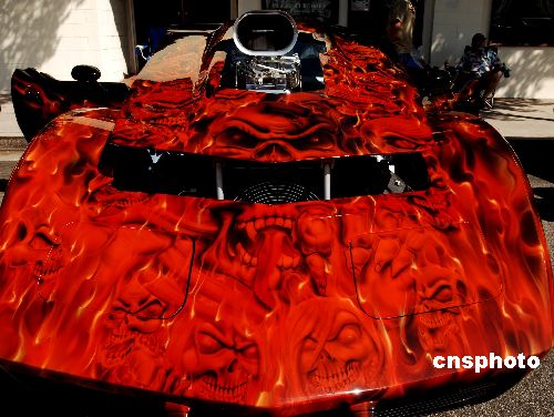 美國洛杉磯十月底萬圣節(jié)前夕,街頭展示獨一無二的紅色魔鬼跑車。中新社發(fā) 賈國榮 攝