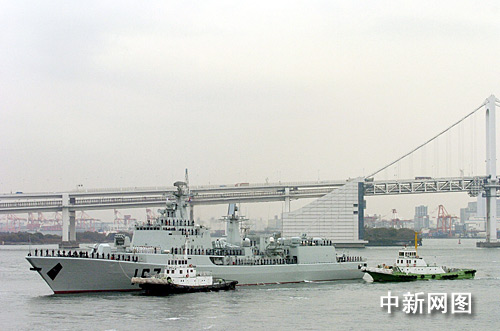 28日當(dāng)?shù)貢r(shí)間上午十點(diǎn),中國(guó)“深圳”號(hào)導(dǎo)彈驅(qū)逐艦順利抵達(dá)東京晴海碼頭,開(kāi)始對(duì)日本為期四天的正式友好訪問(wèn)。圖為“深圳”號(hào)在日本海上自衛(wèi)隊(duì)護(hù)衛(wèi)艦的護(hù)衛(wèi)下駛進(jìn)晴海碼頭。作者:朱沿華
