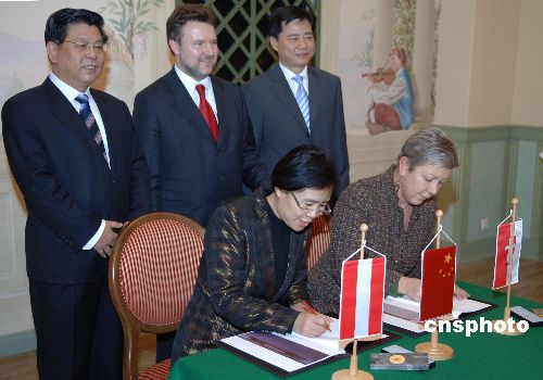 11月30日,維也納中國(guó)文化中心項(xiàng)目的簽字儀式在維也納市政廳舉行。中國(guó)文聯(lián)書記胡振民(后排左一)、中國(guó)駐奧地利大使吳懇(后排右一)出席簽字儀式。圖為奧中文化交流促進(jìn)會(huì)會(huì)長(zhǎng)金鈴和維也納市政府代表(前右)在合作協(xié)議書上簽字。中新社發(fā) 鐘誠(chéng) 攝