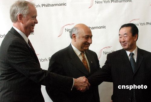 紐約當(dāng)?shù)貢r(shí)間十二月十一日,世界著名樂團(tuán)紐約愛樂樂團(tuán)正式宣布二00八年二月訪問朝鮮,在平壤舉辦音樂會(huì)。當(dāng)日,朝鮮常駐聯(lián)合國(guó)代表樸吉淵出席有關(guān)新聞發(fā)布會(huì)時(shí)表示,他深信此舉將有助于朝美之間加強(qiáng)文化關(guān)系,增進(jìn)兩國(guó)人民的相互理解。圖為紐約愛樂樂團(tuán)主席保羅‧庫恩達(dá)(左)、團(tuán)長(zhǎng)扎林·梅塔(中)和樸吉淵在發(fā)布會(huì)后握手互祝訪問成功。中新社發(fā) 李靜 攝