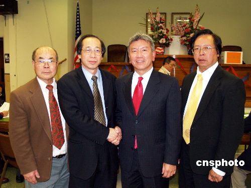 12月17日,美國(guó)洛杉磯華埠中華會(huì)館已有114年歷史,選出的2008年新一屆主席伍競(jìng)?cè)汉透敝飨S新周,在接受現(xiàn)任主席張自豪的祝賀。中新社發(fā) 盧威 攝