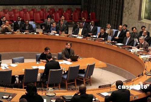 聯(lián)合國(guó)安理會(huì)二十七日就威脅國(guó)際和平與安全的恐怖主義問(wèn)題舉行緊急磋商,并通過(guò)主席聲明,用“最強(qiáng)烈的字眼”譴責(zé)當(dāng)日早些時(shí)候發(fā)生在巴基斯坦的致使貝·布托遇害身亡的恐怖襲擊事件。中新社發(fā) 李靜 攝