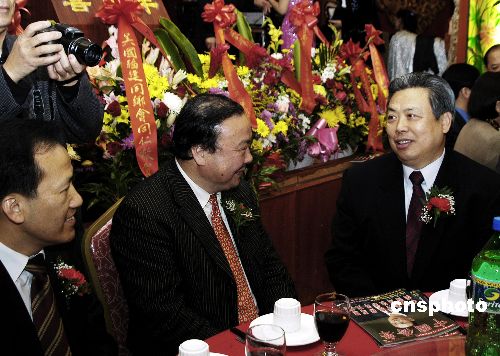 當?shù)貢r間一月八日晚,中國駐紐約總領(lǐng)事館總領(lǐng)事彭克玉大使(右)在紐約曼哈頓華埠美東僑界為他舉辦的歡迎晚宴上與華聯(lián)總會共同主席梁冠軍(左)和陳清泉(中)親切交談。中新社發(fā) 鄧悅 攝