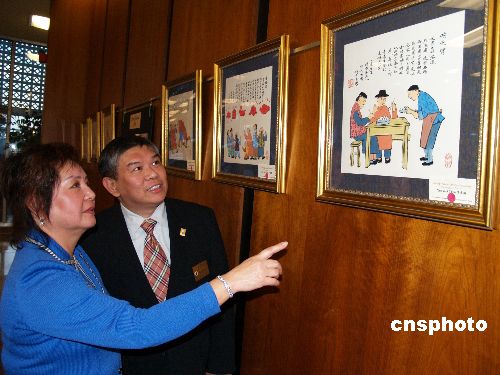 2008年1月9日,華人聚集的洛杉磯阿罕伯拉市舉行中國年畫拍賣會,為阿罕伯拉市高中籌集教育基金。成都女畫家陳雪梅的12幅鼠年年畫,為美國中學(xué)生籌得近5000美金。阿罕伯拉市華裔市長沈時康、拍賣活動負(fù)責(zé)人陳惠萍欣賞中國年畫。中新社發(fā) 盧威 攝