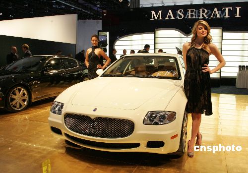 底特律當(dāng)?shù)貢r(shí)間一月十三日,在2008年北美國際汽車展上,瑪莎拉蒂豪華房車與時(shí)尚美女華麗現(xiàn)身。中新社發(fā) 潘索菲 攝