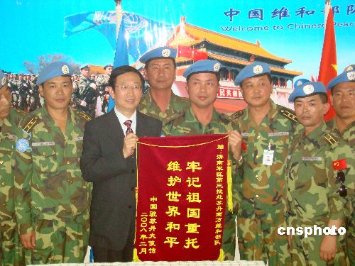 當(dāng)?shù)貢r(shí)間2月3日下午,中國(guó)駐蘇丹大使李成文在董建東武官的陪同下,帶領(lǐng)中國(guó)石油天然氣集團(tuán)公司代表一行5人乘專機(jī)前往蘇丹南部城市瓦烏,慰問中國(guó)駐蘇丹維和工兵、運(yùn)輸、醫(yī)療分隊(duì)。李大使代表中國(guó)駐蘇丹大使館向維和部隊(duì)贈(zèng)送一面鑲有“牢記祖國(guó)重托、維護(hù)世界和平”字樣的錦旗及慰問品。隨同的中國(guó)石油天然氣集團(tuán)公司代表向維和部隊(duì)贈(zèng)送1000余公斤新鮮蔬菜。中新社發(fā) 劉恩海 攝