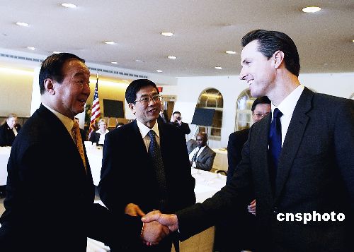 當?shù)貢r間二月四日,北京奧組委執(zhí)行副主席蔣效愚和舊金山市長紐森共同簽署了《第二十九屆奧林匹克運動會組織委員會與美國奧委會奧運火炬接力服務協(xié)議》和《第二十九屆奧林匹克運動會組織委員會與舊金山市奧運火炬接力服務協(xié)議》。圖為蔣效愚(左)高占生(中)和紐森在簽字儀式現(xiàn)場。中新社發(fā) 陳鋼 攝