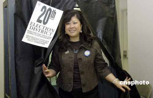 圖為其中之一的華埠第二十選區(qū)的司徒仲菁5日在孔子大廈投完一票。她是希拉里競(jìng)選團(tuán)隊(duì)的紐約亞裔社區(qū)顧問(wèn)。