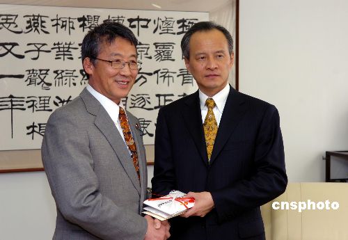 發(fā)表評論 2月7日,日本執(zhí)政黨之一的自民黨國際局長三原朝彥(左)來到中國駐日使館,代表該黨向中國雨雪災(zāi)區(qū)捐款。中國駐日大使崔天凱作為中國政府代表接受此項捐款。中新社發(fā) 滕劍峰 攝