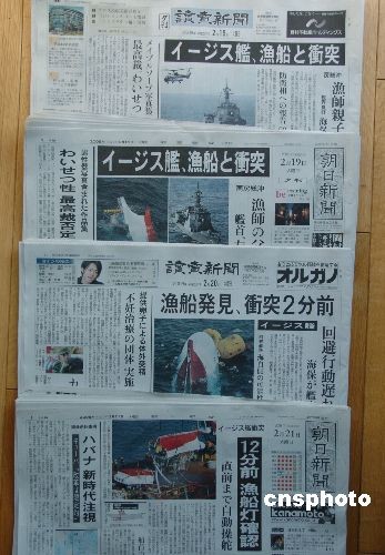 針對(duì)2月19日發(fā)生的日本宙斯盾軍艦撞沉漁船的事故,日本各大媒體連日來均在頭版頭條位置或者新聞節(jié)目的頭條時(shí)間突出報(bào)道,圖為19日至21日的合計(jì)發(fā)行量近2000萬份的《讀賣新聞》和《朝日新聞》的頭版頭條報(bào)道。據(jù)報(bào)道,撞擊事件在日本政界引發(fā)了軒然大波,在野黨紛紛質(zhì)疑擁有“世界上最先進(jìn)的雷達(dá)系統(tǒng)”的軍艦為何突然不靈了,而首相福田則可能因此再次遭受新的打擊。中新社發(fā) 段躍中 攝