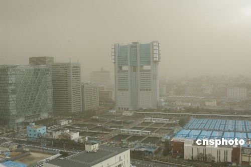 2月23日午后,東京出現(xiàn)大風(fēng)天氣,瞬間風(fēng)力達(dá)到15.9公里,一時間,黃沙漫天。圖為東京都港區(qū)的高層建筑群浸潤在黃色沙塵中。中新社發(fā) 滕劍峰 攝