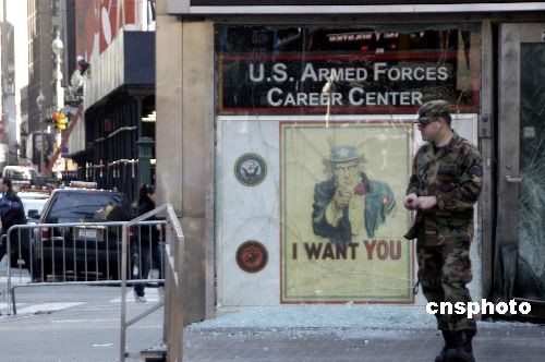 3月6日凌晨3時45分左右,紐約時代廣場一征兵點門口發(fā)生爆炸,但沒有造成人員傷亡。紐約警方稱,事發(fā)當時該征兵點無人駐守,爆炸僅造成該征兵點門窗破損,目前相關(guān)調(diào)查正在進行當中。中新社發(fā) 譚宏偉 攝