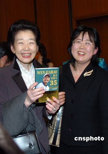 3月7日晚,在中國駐日大使館舉行的慶祝三八國際勞動婦女節(jié)招待會上,日本僑報社長張景子向日本首相夫人福田貴代子和少子化對策專任大臣上川陽子贈送了該社出版的日文版《35號投手溫家寶》。中新社發(fā) 段躍中 攝