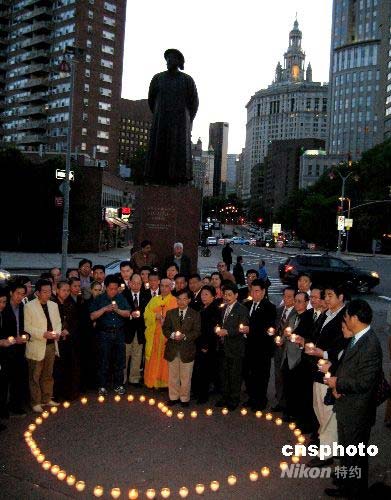 美東華人社團(tuán)聯(lián)合總會(huì)于十三日晚八點(diǎn)在紐約曼哈頓中國(guó)城的林則徐廣場(chǎng)發(fā)起了美東華人燭光祭奠中國(guó)地震災(zāi)區(qū)死難同胞的紀(jì)念活動(dòng),華聯(lián)總會(huì)下屬的多個(gè)僑團(tuán)都派代表出席,大家共同祈禱祝福幸存的災(zāi)區(qū)同胞平安度過(guò)難關(guān)。圖為活動(dòng)現(xiàn)場(chǎng)。中新社發(fā) 鄧悅 攝