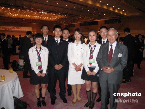 5月14日晚,由日本財(cái)團(tuán)法人日中友好會(huì)館、社團(tuán)法人日中友好協(xié)會(huì)主辦的歡迎中國高中生400人訪問團(tuán)酒會(huì)在東京舉行。作為2008年“二十一世紀(jì)東亞青少年大交流計(jì)劃”的第二批,他們將參加與日中關(guān)系相關(guān)的研討會(huì),走進(jìn)日本高中課堂,在日本高中學(xué)生家庭住宿外,還將進(jìn)行文化、經(jīng)濟(jì)、社會(huì)等方面的考察。圖為出席酒會(huì)的四川高中生和日中友好會(huì)館谷野作太郎副會(huì)長合影。中新社發(fā) 段躍中 攝