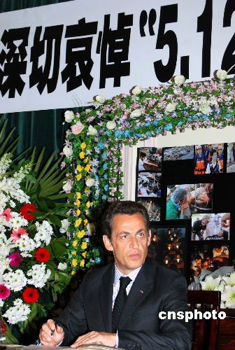 巴黎時(shí)間五月十九日下午,法國總統(tǒng)薩科奇來到中國駐法國大使館,對中國四川汶川地震遇難者表示深切哀悼。圖為薩科奇在留言簿上留言。