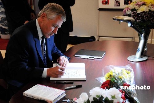 美國(guó)國(guó)會(huì)參院外交關(guān)系委員會(huì)成員、聯(lián)邦參議員恰克·黑格爾,當(dāng)?shù)貢r(shí)間五月十九日傍晚來到中國(guó)駐美國(guó)大使館悼念中國(guó)四川大地震遇難者。圖為黑格爾參議員在悼念紀(jì)念冊(cè)上留言:我為那些在四川大地震中遇難的中國(guó)人民感到悲痛,我堅(jiān)信中國(guó)人民在政府的支持下能夠克服目前的困難。