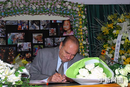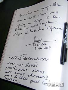 巴黎時(shí)間二十一日上午,法國(guó)前總統(tǒng)希拉克專程來(lái)到中國(guó)駐法國(guó)大使館,向中國(guó)汶川地震的遇難者表示深切哀悼。希拉克在吊唁簿上寫道:“對(duì)中國(guó)遇難者及他們的家屬表示深切的哀悼和慰問(wèn),對(duì)偉大的中國(guó)人民在此次抗震救災(zāi)中的表現(xiàn)表示欽佩! 作者:吳衛(wèi)中