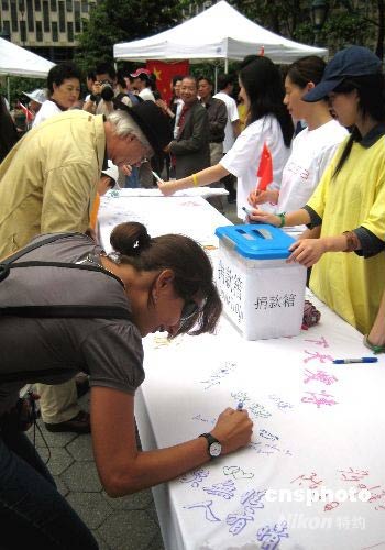 5月31日,由大紐約地區(qū)僑界、商界、學(xué)界共同發(fā)起的“手拉手,心連心,情系災(zāi)區(qū),賑災(zāi)助學(xué)”大型義演活動(dòng)在紐約曼哈頓舉行。本次活動(dòng)全部募捐所得款項(xiàng)都將轉(zhuǎn)交中國(guó)駐紐約總領(lǐng)事館,用于幫助四川災(zāi)區(qū)兒童盡快重返校園。圖為觀看義演活動(dòng)的外國(guó)友人捐款后在“災(zāi)無(wú)情、人有情”的橫幅上簽名,祝福中國(guó)災(zāi)區(qū)人民早日重建家園。中新社發(fā) 鄧悅 攝