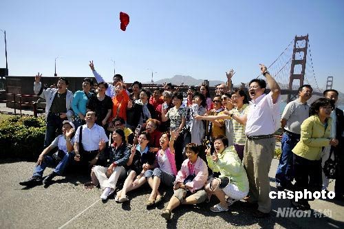 圖:中國公民赴美旅游首發(fā)團游覽金門大橋