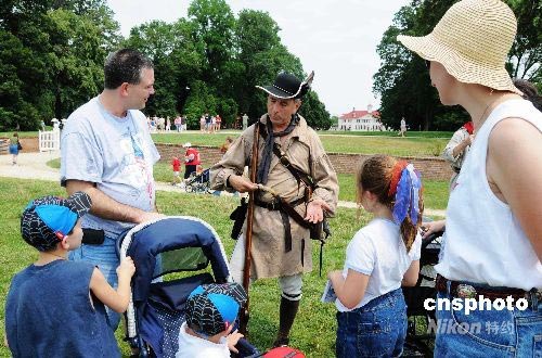 在美國開國總統(tǒng)喬治華盛頓的故居弗吉尼亞州芒特弗農(nóng),7月4日舉行了多種活動紀念美國國慶,許多人裝扮成二百多年前獨立戰(zhàn)爭時期的士兵,和游人合影,并且還舉行了鳴槍儀式。圖為華盛頓故居弗吉尼亞州芒特弗農(nóng)山莊的一個古裝士兵在展演手中的武器。中新社發(fā) 邱江波 攝