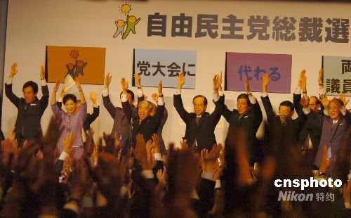 圖為選舉結(jié)束后,前總裁福田康夫及眾候選人在該黨參議院議員會(huì)長(zhǎng)尾辻帶領(lǐng)下與現(xiàn)場(chǎng)黨員一起三呼萬(wàn)歲。