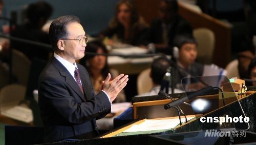 中國總理溫家寶24日在紐約聯(lián)合國總部出席第63屆聯(lián)大一般性辯論,并作題為“堅持改革開放,堅持和平發(fā)展”的演講,闡述“后奧運(yùn)中國”政治經(jīng)濟(jì)走向。中新社發(fā) 李靜 攝