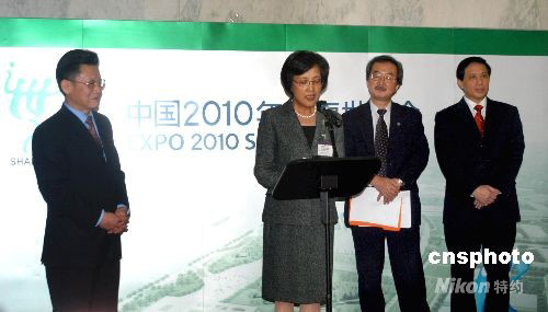 當?shù)貢r間十月六日,“上海世博會聯(lián)合國圖片展”在紐約聯(lián)合國總部開幕。上海世博會執(zhí)委員常務副主任鐘燕群(中)介紹上海世博會籌備情況。聯(lián)合國副秘書長沙祖康(左)、副秘書長赤阪清隆(右二)和中國常駐聯(lián)合國代表張業(yè)遂出席開幕式(右)。該圖片展由上海世博會事務協(xié)調(diào)局、中國常駐聯(lián)合國代表團和上海市對外文化交流協(xié)會共同舉辦。中新社發(fā) 汪晨 攝
