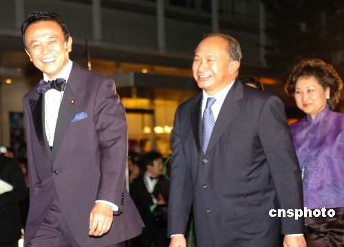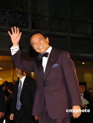 10月18日傍晚,第21屆東京國際電影節(jié)開幕。以“環(huán)!睘橹黝}的本屆電影節(jié)別出心裁地將星光大道的地毯由紅色改為綠色。上個月剛剛當(dāng)選日本首相的麻生太郎與開幕影片《赤壁》劇組成員同走綠地毯,成為第一個光臨東京國際電影節(jié)現(xiàn)場的日本總理大臣。中新社發(fā) 朱沿華 攝