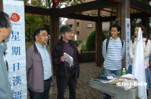 10月26日,由日本僑報社創(chuàng)辦的星期日漢語角在東京西池袋公園舉行第63次交流會。正在上海同濟大學留學的日本人高倉宏充,利用臨時回國的機會,詳細報告了他9月開始留學上海的情況,受到漢語角參加者的好評,不少人表示一定要去上?纯础8邆}宏充還介紹了參加上海日語角和英語角的體會,引起大家的強烈興趣。圖為高倉宏充(中)在漢語角報告。中新社發(fā) 段躍中 攝